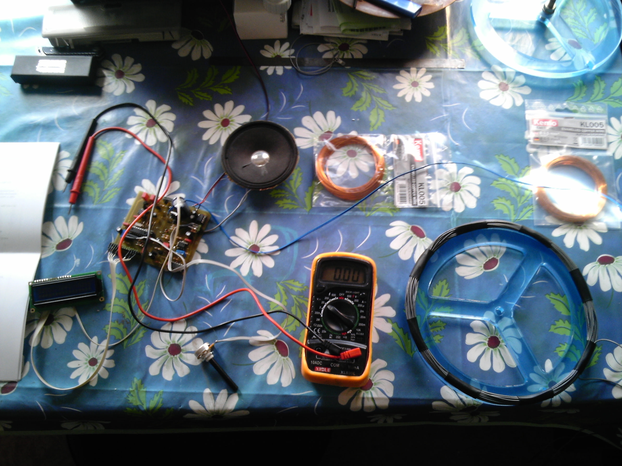 Ich baute die Elektronik-Platine des GoldPic3 in das Gehäuse, zusätzlich ein kleine Ladeelektronik für die Akkus und fertigte eine Spule an. Mit dem GoldPic kann man, wenn er ordentlich aufgebaut ist, problemlos Münzen bis zu einer Tiefe von ca. 25cm finden. Allerdings kommt es hier auf viele Faktoren an, z.B. wie die Münze liegt (flach oder hochkant) und wie stark die Boden-Mineralisierung ist.